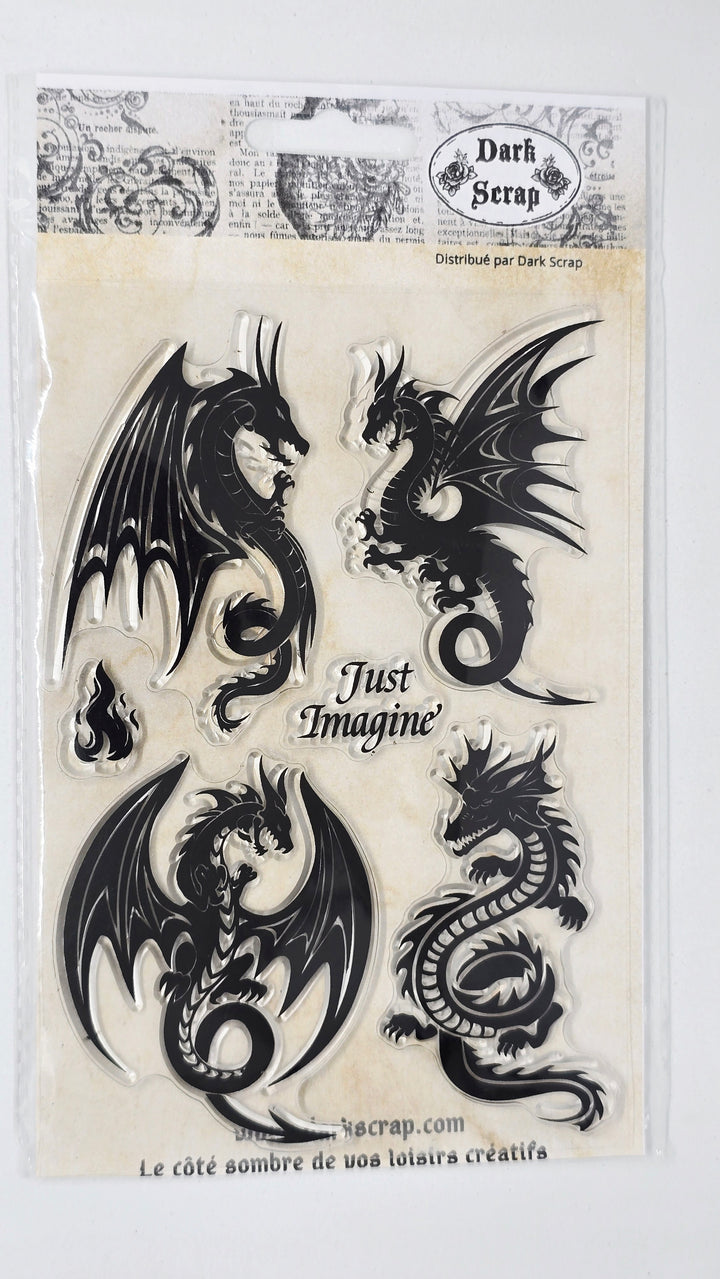 🔎 1 sheet of transparent silicone stamp 16x11 cm with dragon, fire and word designs