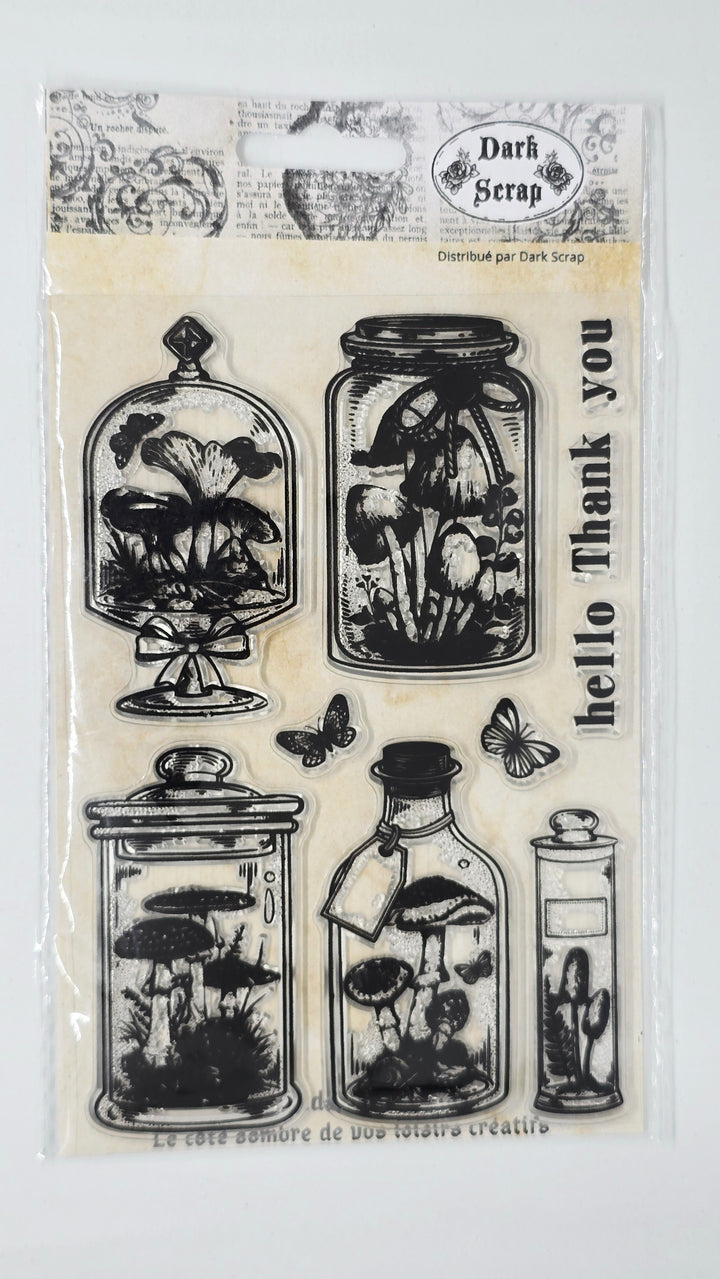 🔎 1 feuille de tampon en silicone transparent de 16x11 cm avec des motifs de flacons différents contenant champignon,papillons, Fioles...