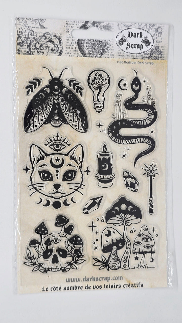 Tampon symboles, chat mystique, 3ème oeil, champignons