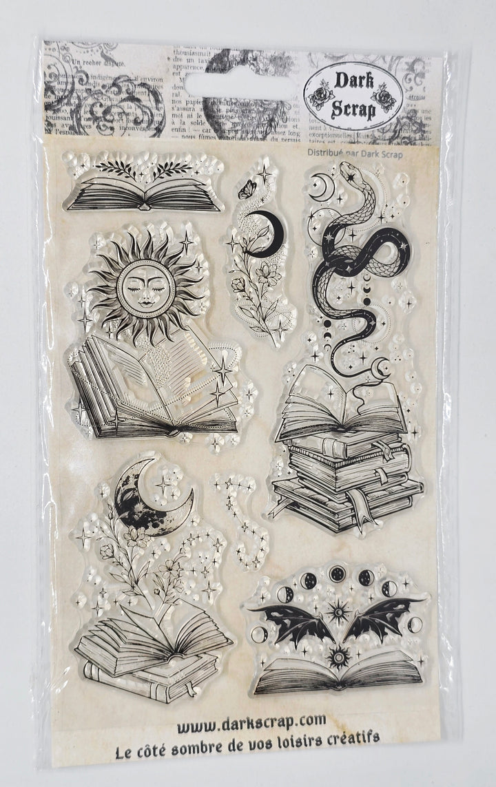 🔎 1 feuille de tampon en silicone transparent de 16x11 cm avec des motifs de lune, serpent mystique, phase de la lune, étoiles, livres soleil, ailes de chauve-souris